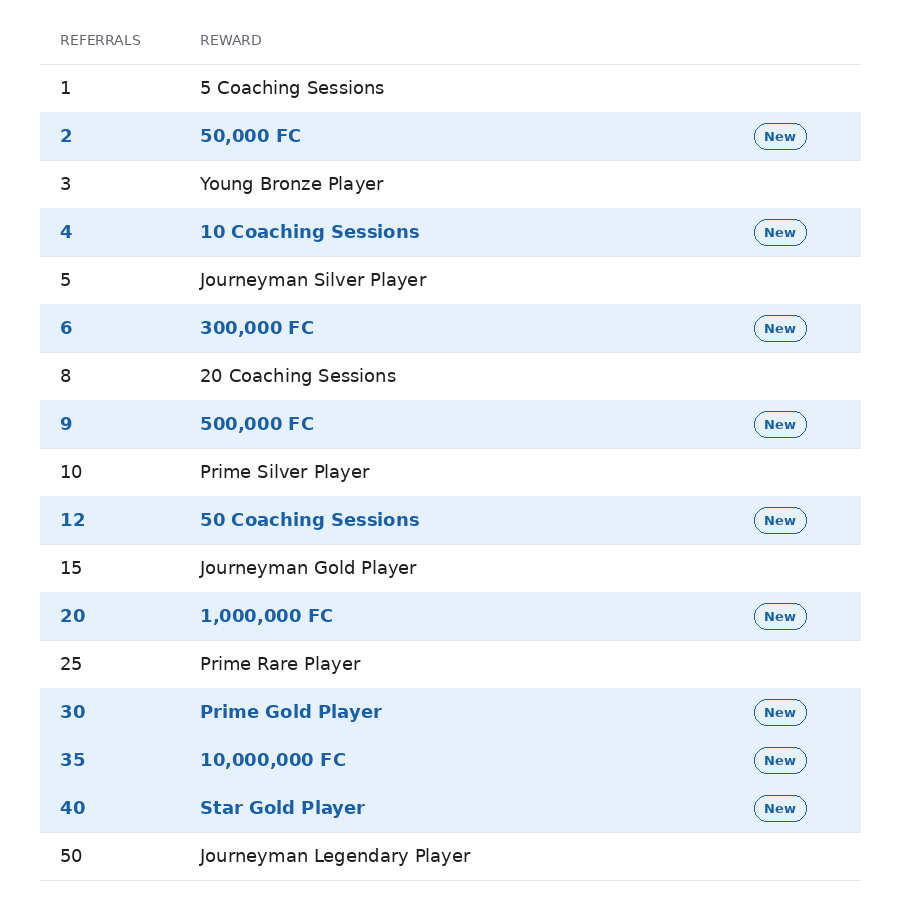 Previously, referred friends received 3 Common Players and 5 Coaching Sessions. It was a nice bonus, but we wanted to give new managers more of a boost, especially now that FC is part of the game.