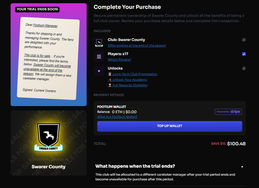If they enjoy the game and decide to upgrade at any point, they keep the same club they’ve been managing all season. Nothing resets and no progress is lost. Upgrades can be done by owning just the club for $30 or by purchasing a full Starter Bundle for $100. Once upgraded, they also become eligible for any rewards they would have earned during the season.
